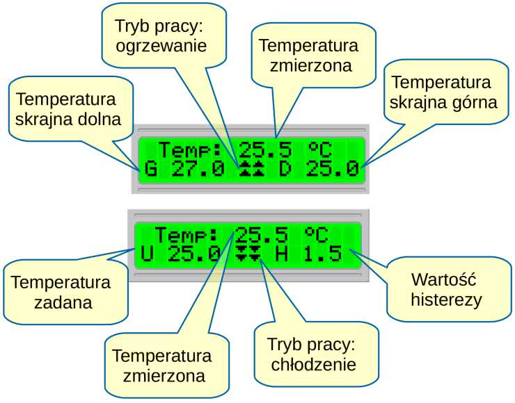 Wybór trybu ustawiania parametrów jest wykonywany za pomocą zworek zakładanych na złącze JP1. Wygląd ekranu głównego będzie nieznacznie różnił się w zależności od wybranego trybu. Wygląd obu wersji oraz opis znaczenia wyświetlanych parametrów pokazano na rysunku 2.