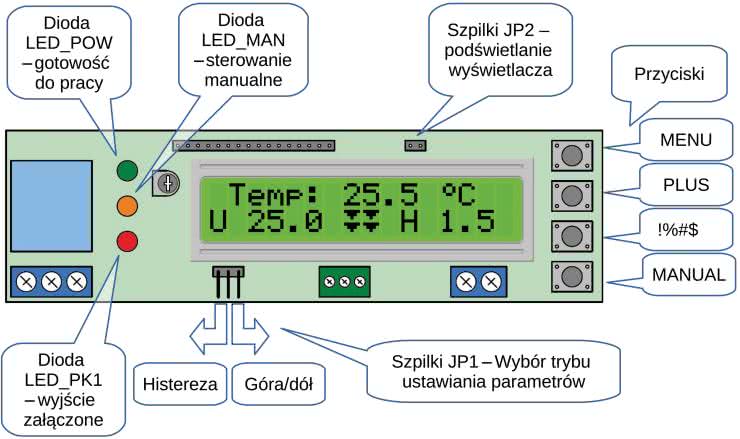 Stan urządzenia jest dodatkowo sygnalizowany za pomocą trzech diod LED. Dioda LED_POW sygnalizuje gotowość do pracy, LED_MAN świeci, jeśli jest uruchomiony tryb sterowania ręcznego, a dioda LED_PK1 informuje o załączeniu wyjścia termostatu.