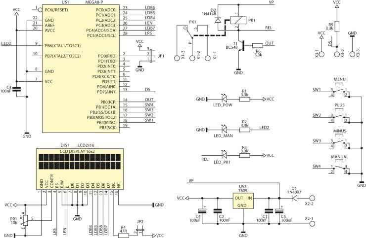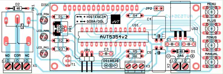 Schemat ideowy termostatu pokazano na rysunku 4. Jego pracą steruje mikrokontroler US1. Głównym zadaniem tego układu jest odczyt temperatury z czujnika DS18B20 dołączonego do złącza X3. Komunikacja odbywa się poprzez interfejs 1-Wire. Odczytywana temperatura jest porównywana z ustawionymi parametrami, a efektem jest sygnał sterujący wyjściem urządzenia. Elementem wykonawczym jest przekaźnik, sterowany z mikrokontrolera za pomocą tranzystora T1. Styki przekaźnika są wyprowadzone na złączu X1. Urządzenie wyjściowe można włączyć w obwód styków normalnie otwartych – wtedy załączenie przekaźnika spowoduje załączenie urządzenia.