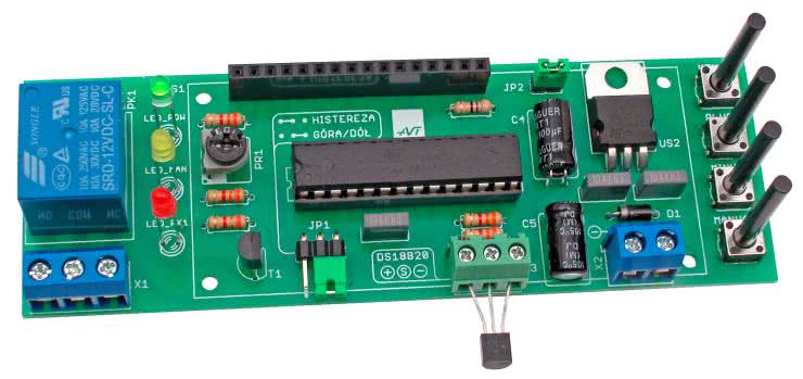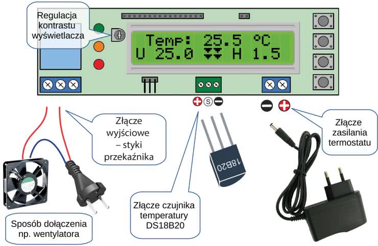 Po zmontowaniu należy do odpowiednich zacisków dołączyć przewody zasilające np. z zasilacza, czujnik temperatury oraz ustawić potencjometr kontrastu na godzinę 5. Warto też od razu wybrać sposób ustawiania za pomocą szpilek JP1 oraz załączyć podświetlanie wyświetlacza – szpilki JP2. Dopiero wtedy można zamontować wyświetlacz i włączyć zasilanie.
