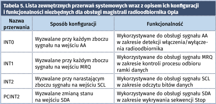 To tyle, jeśli chodzi o opis modułu wyświetlacza pokładowego. Przejdźmy zatem do szczegółów implementacyjnych. Jako, że nasze urządzenie multiTID realizuje szereg dość skomplikowanych funkcjonalności, które wymagają ścisłych zależności czasowych i zaangażowania wielu peryferiów mikrokontrolera, obsługa emulacji wyświetlacza TID (czyli obsługa radioodbiornika) została zrealizowana z wykorzystaniem 4 zewnętrznych przerwań systemowych. Taka mnogość wykorzystywanych przerwań wynika z faktu obsługi aż 4 sygnałów sterujących (AA, MRQ, SCL, SDA) przy braku możliwości realizacji sprzętowej obsługi magistrali I²C. W tabeli 5 pokazano zestawienie wykorzystywanych, zewnętrznych przerwań systemowych, ich konfigurację oraz realizowaną funkcjonalność.