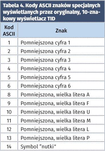 W tabeli 4 umieszczono kody ASCII i opis znaków specjalnych wyświetlanych przez oryginalny wyświetlacz TID a obsługiwane przez sterownik multiTID. Wcześniejszy opis dotyczy wyświetlaczy o organizacji 10-znakowej. Dla starszych wyświetlaczy, o organizacji 8-znakowej, jest przesyłanych wyłącznie 10 bajtów danych, z czego 2 pierwsze bajty odpowiadają za wyświetlanie piktogramów pokazywanych na ekranie wyświetlacza TID (tylko status radia i magnetofonu), zaś kolejne 8 bajtów to kody znaków ASCII przeznaczonych do wyświetlenia w polu tekstowym wyświetlacza (tylko wielkie litery i cyfry, bez znaków specjalnych). Inny jest też adres samego wyświetlacza, który przyjmuje wtedy wartość 0x4A. Już tylko dla porządku dodam, że każdy bajt danych przesłany przez master do slave jest potwierdzany przez układ podrzędny (TID) poprzez wygenerowanie sygnału ACK (wyzerowanie linii SDA) w dziewiątym takcie zegara magistrali (SCL) i to niezależnie czy przesyłane dane dotyczą naszego urządzenia (przesłano wcześniej zgodny adres I²C), czy też nie, co również wymyka się standardom wyznaczonym przez specyfikację interfejsu I²C. Sytuację taką przedstawiono na rysunku 5, który to prezentuje przebiegi na magistrali danych zarejestrowane podczas współpracy radioodbiornika CAR300 z nowym, 10-znakowym wyświetlaczem pokładowym TID.