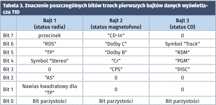 W tabeli 3 opisano znaczenie poszczególnych bitów trzech pierwszych bajtów danych odpowiedzialnych za wyświetlanie specjalnych piktogramów na ekranie wyświetlacza TID.