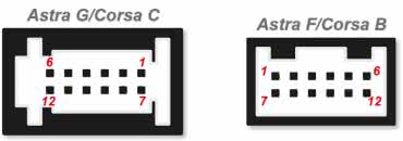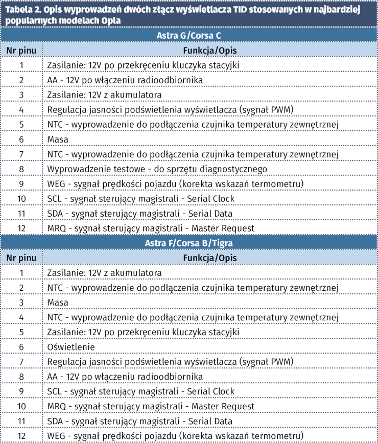 Na rysunku 1 zamieszczono rozkład wyprowadzeń dwóch złącz wyświetlacza TID stosowanych w najbardziej popularnych modelach Opla, tj. Astra F/G i Corsa B/C. W tabeli 2 umieszczono opis wyprowadzeń tych złącz. Paleta stosowanych złącz jest znacznie szersza.