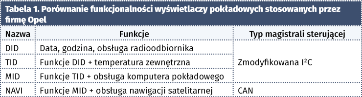 Zanim przejdziemy do szczegółów implementacyjnych warto przyjrzeć się rozwiązaniu zastosowanemu przez Opla, gdyż jest to przykład dobrze wykonanej pracy inżynierskiej i dogłębnie przemyślanej konstrukcji. Zgodnie z tym, o czym wspominano wcześniej, firma Opel od wielu lat stosuje w swoich pojazdach zewnętrzne, zintegrowane z deską rozdzielczą, podświetlane wyświetlacze LCD, których funkcje zależne są od modelu auta, jego wyposażenia, roku produkcji jak i modelu samego wyświetlacza. Ogólnie rzecz ujmując można wyróżnić kilka typów wyświetlaczy, których poglądowe porównanie przedstawiono w tabeli 1.
