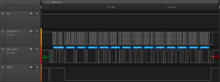 Po czasie T3 (1…2 ms) od ostatniego zwolnienia linii MRQ będącego jednocześnie końcowym elementem procedury Power On Test, układ Master ponownie zeruje linię MRQ, tym razem jednak z zupełnie innego powodu. Po pierwsze, sygnalizuje w ten sposób zamiar transmisji danych, a po drugie, sprawdza obecność slave na magistrali danych oraz jego gotowość na odbieranie pakietu danych, gdyż działanie takie podejmowane jest każdorazowo na początku każdej transmisji z radioodbiornika do wyświetlacza TID. Po wymuszeniu poziomu niskiego na linii MRQ, slave musi w czasie T4 (100 ms…15 ms) zewrzeć linię SDA do masy sygnalizując w ten sposób swoją obecność, jak i gotowość do odbierania danych. Jeśli tego nie zrobi, master powinien zakończyć w tym miejscu bieżącą transmisję danych. Dalej, wyzerowaniu linii SDA przez slave, master zwalnia linię MRQ (zostaje ona ustawiona), co powinno skutkować zwolnieniem linii danych SDA przez slave po czasie T5 (100…200 ms). Na tym etapie rozpoczyna się właściwa transmisja danych zgodna ze specyfikacją standardu I²C, z jednym, drobnym, acz istotnym wyjątkiem, o którym mowa będzie w dalszej części artykułu.