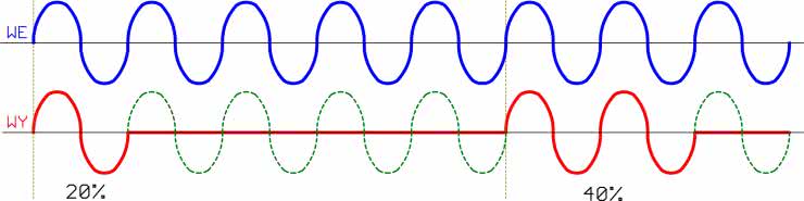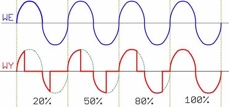 Typowa, stosowana w Europie sieć energetyczna 230 V AC dostarcza napięcie przemienne o kształcie sinusoidalnym. W uproszczeniu, regulacja fazowa polega na zasilaniu odbiornika nie całym przebiegiem sinusoidalnym, ale jego częścią. Przebiegi na wejściu regulatora i wyjściu, dla różnych ustawień mocy, pokazano na rysunku 1.