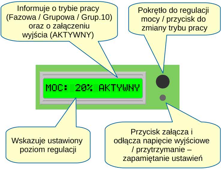 Interfejs użytkownika tworzą: wyświetlacz, impulsator z przyciskiem oraz przycisk. Na wyświetlaczu prezentowane są informacje o poziomie regulacji, w zakresie 0...100% oraz o wybranej metodzie regulacji Fazowa / Grupowa / Grup10. Jeśli jest aktywne wyjście układu, to zamiast metody regulacji jest wyświetlane migające ostrzeżenie AKTYWNY.