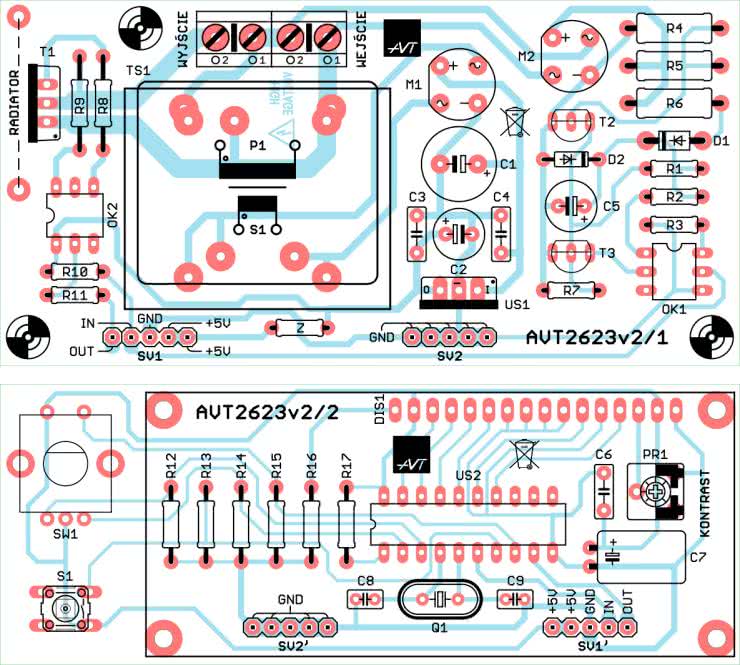 Urządzenie zostało zaprojektowane dla elementów przewlekanych, więc montaż nie powinien sprawić trudności. Należy jedynie zwrócić uwagę na poprawną polaryzację elementów półprzewodnikowych, zwłaszcza mostków prostowniczych M1 i M2 oraz elementów optoelektonicznych OK1 i OK2. W urządzeniu będą występowały napięcia niebezpieczne dla życia i zdrowia, dlatego zanim zostanie dołączone zasilanie musimy mieć pewność, że montaż został wykonany prawidłowo. Schematy montażowe obu płytek pokazano na rysunku 6. W montażu przyda się też fotografia 7.