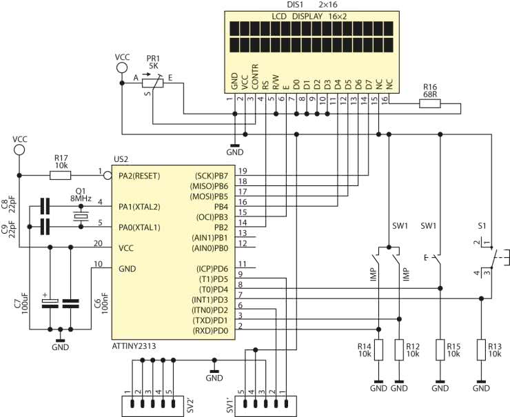 - US2: ATtiny2313 (zaprogramowany)