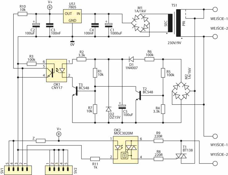 - TS1: transformator230 V/8…10 V AC, 2…3 VA