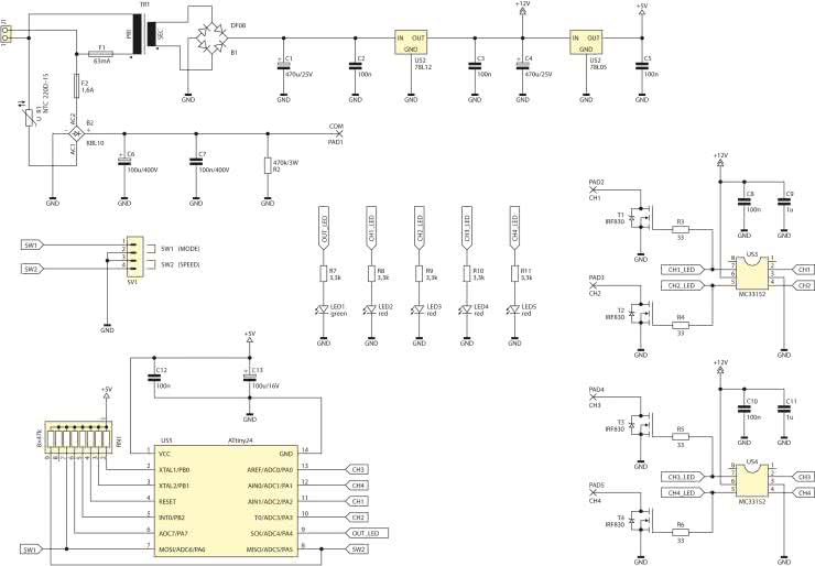 Sterowaniem tranzystorami zajmuje się mikrokontroler ATtiny24. Czterokanałowe sterowanie PWM zostało zrealizowane w sposób programowy. Kondensatory C12 i C13 filtrują jego zasilanie, co w układzie pracującym impulsowo wcale nie jest sprawą bagatelną. Do przełączania programów oraz tempa pracy służą dwa przyciski monostabilne: odpowiednio SW1 i SW2, dołączane do złącza SV1. Te wyprowadzenia mikrokontrolera, które nie służą sterowaniu, są podciągnięte na stałe do dodatniego bieguna zasilania poprzez rezystory znajdujące się w drabince RN1. Ustala to jednoznacznie ich potencjał i nie dopuszcza do gromadzenia się na nich ładunków elektrostatycznych.