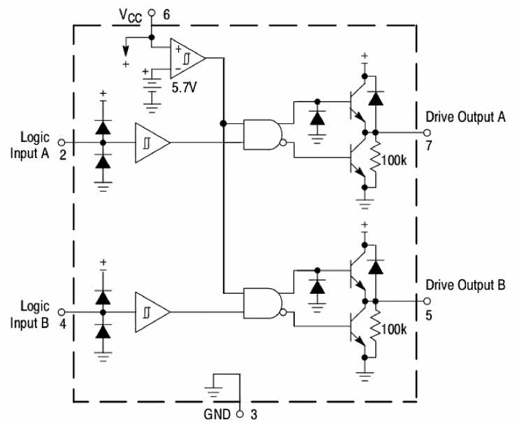 Do sterowania źródłami światła zastosowano tranzystory mocy typu IRF830. Maksymalne napięcie dren-źródło wynoszące 500 V powoduje, że z pewnością nie ulegną przebiciu przy zasilaniu z wyprostowanego napięcia sieciowego (ok. 325 V). Pracują w typowym dla takich zastosowań układzie wspólnego źródła. Zasilanie bramek tranzystorów bezpośrednio z mikrokontrolera nie dałoby dobrych efektów: napięcie progowe IRF830 zawiera się w przedziale 2…4 V, dlatego napięcie 5 V, którym dysponuje mikrokontroler, może (w skrajnej sytuacji) tylko „lekko otworzyć” ten tranzystor. Do tego celu jest przeznaczone napięcie 12 V z zasilacza. Tranzystory wysokonapięciowe, które miałyby dostatecznie niskie napięcie progowe, są bardzo trudne do znalezienia, dlatego taka idea została zarzucona. Konwersji poziomu napięcia (z 0/5 V z mikrokontrolera na 0/12 V na bramkę) dokonują układy typu MC33152. Są to specjalizowane drivery MOSFET. W strukturze zawierają przerzutniki Schmitta oraz wtórniki wyjściowe mogące przenieść prąd do 1,5 A. Producent zadbał również o istotny szczegół, często pomijany na płytkach – rezystory rozładowujące pojemność bramko, przydatne zanim tranzystor mocy zostanie prawidłowo wysterowany. Jeden układ scalony zawiera dwa niezależne drivery. Schemat wewnętrzny tego układu znajduje się na rysunku 2.