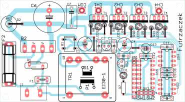 Na samym początku należy na płytce osadzić dwie zwory. Całą resztę podzespołów montuje się tradycyjnie, tj. począwszy od najniższych po coraz wyższe. Pod układy scalone (zwłaszcza US5) polecam zastosować podstawki. Rezystory R2, R3…R6 i R8…R11 powinny zostać zamontowane pionowo.