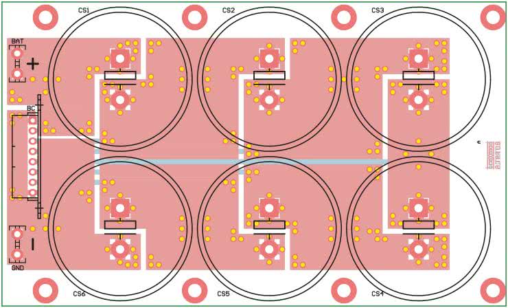 Układ baterii kondensatorów zmontowano na dwustronnej płytce drukowanej. Jej schemat montażowy pokazano na rysunku 3, a płytki balansera na rysunku 4. Montaż układu nie wymaga opisu, należy zadbać o poprawne przylutowanie pada termicznego U1, można także dokleić do niego niewielki radiator SO. Prawidłowo zmontowany moduł przedstawia fotografia tytułowa. Płytka kondensatorów ma odpowiednią liczbę otworów montażowych dla pewnego zamocowania w zasilanym urządzaniu. Warto pamiętać także o odpowiednim zabezpieczeniu wyprowadzeń kondensatorów przed przypadkowym zwarciem poprzez montaż płytki na kołkach dystansowych h>8m i osłonięciu spodu płytki kawałkiem płytki izolacyjnej.