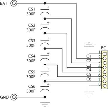 W celu zabezpieczenia akumulatorów przed nierównomiernym rozkładem napięcia zastosowano układ U1 typu BD14400 firmy ROHM. Zawiera on układ balansera z wbudowanymi tranzystorami wykonawczymi, co znacząco upraszcza budowę urządzenia. „Nadwyżki” mocy wytracane są na kluczowanych rezystorach R1…R6 ustalających prąd balansowania (ok. 85 mA). Równolegle do każdego z rezystorów jest dołączona dioda LED (LD1…LD6) sygnalizująca aktywność balansera dla każdego kondensatora składowego. Układ ma możliwość ustalenia napięcia balansowania poprzez zmianę stanów wyprowadzeń VSETx. W modelu dopuszczalne napięcie na kondensatorze ustalano w zakresie 2,4…2,7 V co 100 mV poprzez odpowiednie położenie zwór w złączu CFG, co ułatwia zastosowanie innych typów kondensatorów magazynujących. W wypadku współpracy z typowymi ładowarkami akumulatorów żelowych o napięciu 13,6…14,4 V można bezpiecznie ustalić napięcie balansowania na 2,4…2,5 V.