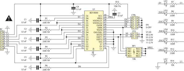 Dioda LD7 sygnalizuje napięcie na kondensatorach. Co prawda, zwiększa ona samorozładowanie baterii, ale dobrze wiedzieć, że w kondensatorach jest zgromadzona energia, gdyż skutki przypadkowego, nieostrożnego zwarcia baterii mogą być opłakane.