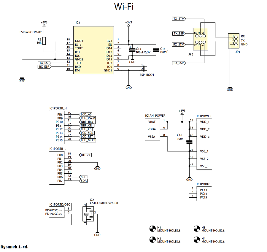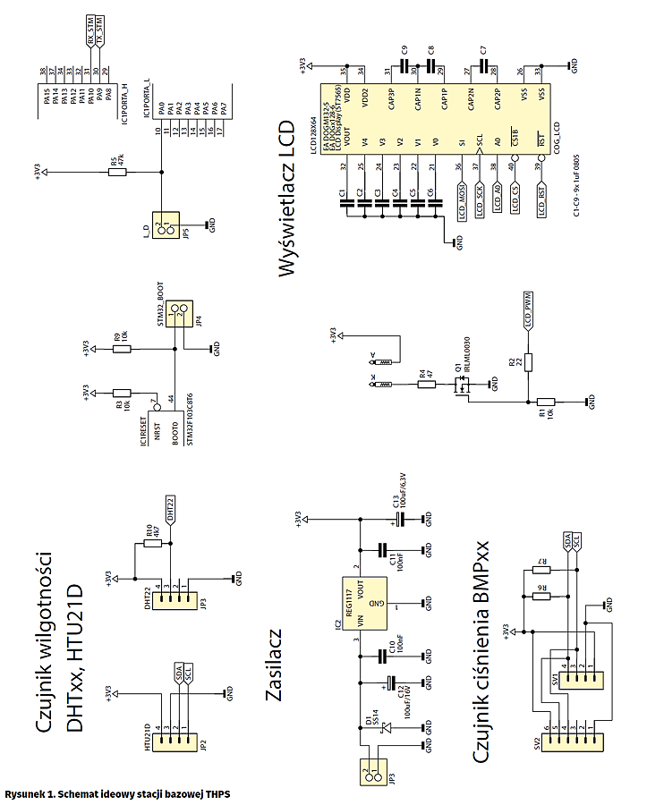 Cała funkcjonalność urządzenia jest zawarta w mikrokontrolerze STM32F103C8T6, który pracuje z użyciem wewnętrznego generatora HSI. Pierwotnie miał on być taktowany za pomocą rezonatora zewnętrznego, ale ostatecznie podczas prób okazało się, że generator HSI ma stabilność wystarczającą dla tej aplikacji. Do wyświetlenia danych z czujników użyto wyświetlacza graficznego wykonanego w technologii COG o rozdzielczości 128×64 piksele ze sterownikiem ST75765R, który był już opisywany na łamach EP. Pozostaje mi jedynie dodać, że jest to jeden z lepszych wyborów pod względem jakości, możliwości i ceny. Dzięki metalowym pinom jest on również bardzo łatwy do przylutowania. Układ podświetlenia wykonano na 1 diodzie LED, która przy prądzie 15 mA daje dosyć światła, aby nawet oświetlić pomieszczenie, w którym jest umieszczone urządzenie. Stacja ma czujnik natężenia oświetlenia zewnętrznego i dostosowuje poziom podświetlenia LCD do warunków panujących w pomieszczeniu.