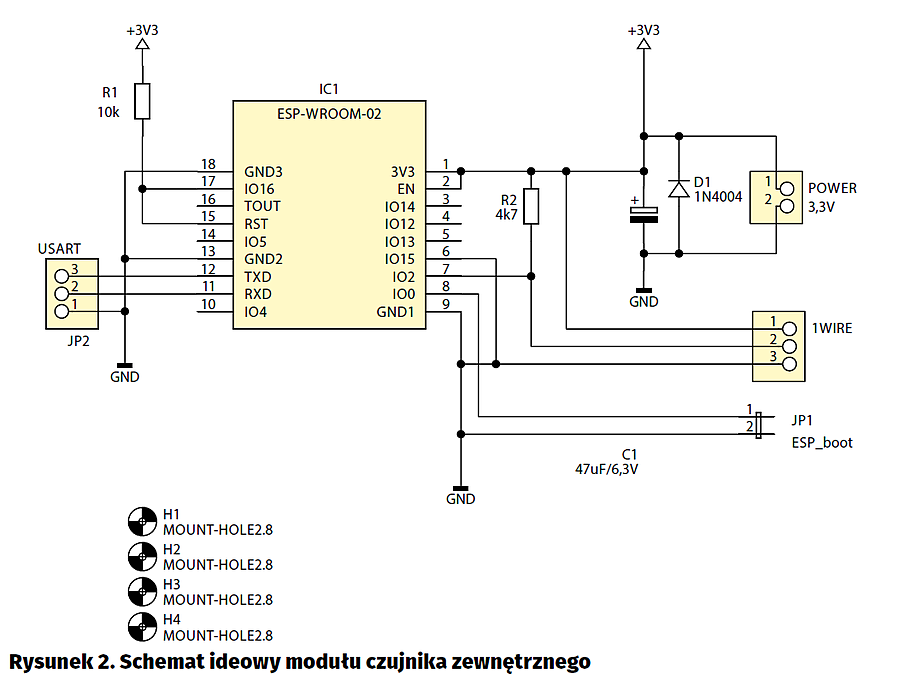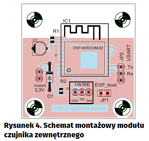 W czujniku zewnętrznym pracuje dobrze znany sensor DS18B20. Schemat ideowy modułu zewnętrznego pokazano na rysunku 2 Jak widać ogranicza się on do modułu WiFi, czujnika temperatury i zworki umożliwiającej zaprogramowanie układu. Dioda D1 zabezpiecza układ przed odwrotnym podłączeniem zasilania. Dzięki możliwości zaprogramowania układu ESP8266, nie musimy stosować dodatkowych mikrokontrolerów odczytujących temperaturę i sterujących pracą modułu.