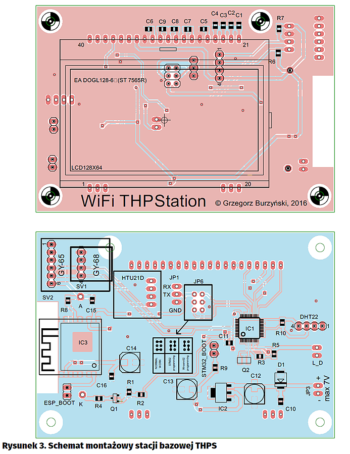 Schemat montażowy stacji bazowej pokazano na rysunku 3, a zdalnego sensora na rysunku 4. Montaż rozpoczynamy od przylutowania elementów zasilacza i sprawdzenia jego napięcia wyjściowego. W tym celu zasilamy układ ze źródła napięcia – najlepiej stabilizowanego – z zakresu 5…7 V. Wyższe napięcie będzie powodowało grzanie się stabilizatora i może wpływać na fałszowanie wyników pomiaru temperatury z czujnika BMP. Jeśli napięcie za stabilizatorem wynosi 3,3 V, to możemy przystąpić do przylutowania mikrokontrolera STM32. Następnie lutujemy moduł WROOM-02, a dopiero na koniec wszystkie pozostałe elementy po stronie BOTTOM, łącznie z goldpinami. Teraz odwracamy płytkę na stronę TOP, montujemy kondensatory C1…C9 i w zależności od potrzeb – rezystory R6 i R7. Są to rezystory zasilające szynę I2C. Jeśli te rezystory są zamontowane na modułach czujników, to montaż R6 i R7 można pominąć.