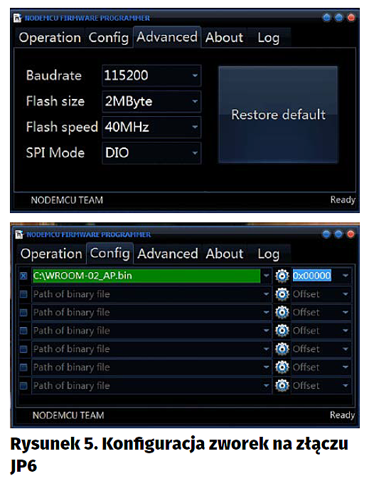 Po zaprogramowaniu odłączamy zasilanie układu, zakładamy zworkę na złącze STM32_BOOT i włączamy zasilanie. Od teraz powinien działać odczyt parametrów z czujników temperatury, wilgotności i ciśnienia. Jeśli na wyświetlaczu ukażą nam się pomiary, możemy przejść do programowania układu WROOM-02. W tym celu odłączamy zasilanie modułu i łączymy piny 3-5 oraz 2-4 za pomocą zworek w złączu JP6 (konfiguracja WROOM-02 programming). Zakładamy zworkę na piny złącza ESP_BOOT, włączamy zasilanie i uruchamiamy program Nodemcu Firmware Programmer – można pobrać go z Internetu. Aby go odnaleźć, należy w wyszukiwarce wpisać nazwę nodemcu flasher. W zakładce Operation należy wybrać port COM, do którego mamy dołączoną przejściówkę. W zakładce Advanced ustawiamy: Baudrate – 115200, Flash size – 2Mbyte, Flash speed 40MHz, SPI Mode – DIO. Przechodzimy do zakładki Config i wybieramy ścieżkę dostępu do programu do wgrania. Po lewej stronie zaznaczamy „x” w niebieskim małym kwadracie, po prawej – wybieramy adres 0x0000. Prawidłowe ustawienia pokazano na rysunku 6. Gdy wszystko jest ustawione, przechodzimy do zakładki Operation i klikamy przycisk START. Po chwili powinny zostać wyświetlone adresy MAC dla trybów AP i STA oraz rozpocząć się programowanie modułu. Po zakończeniu wyłączamy zasilanie stacji, zdejmujemy zworkę ze złącza ESP_BOOT, odłączamy przejściówkę i wpinamy zworki w złączu JP6 do trybu pracy NORMAL WORK (łączymy piny 1-2 i 5-6). Po włączeniu zasilania na wyświetlaczu powinny być wyświetlone wartości odczytane z czujników.