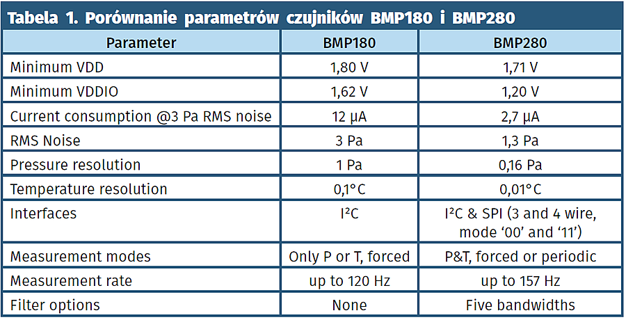 Czujniki BMP085, BMP180 oraz BMP280 są wysokiej klasy czujnikami ciśnienia firmy Bosch. Charakteryzują się dużą dokładnością pomiaru ciśnienia i temperatury. Dwa pierwsze komunikują się za pomocą interfejsu I2C, a BMP280 umożliwia wybranie SPI lub I2C (wyboru dokonuje się dołączając wejście CSB do masy lub napięcia zasilania; w naszym wypadku do VCC, co powoduje aktywowanie interfejsu I2C). W zasadzie czujnik BMP180 jest zamiennikiem starszego modelu BMP085 – w tych samych rejestrach ma współczynniki kalibracyjne, a obsługa programowa jest niemal identyczna. W tabeli 1 wymieniono i porównano parametry czujników BMP180 i BMP280 (źródło – BMP280 Data sheet).