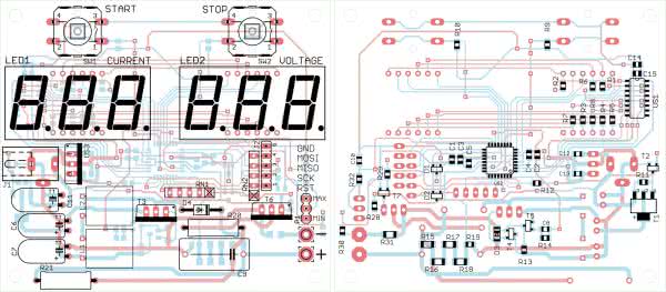 Do pomiaru napięcia na zaciskach formowanego kondensatora służy dzielnik składający się z rezystorów R15-R19. Szeregowe połączenie czterech rezystorów w obudowach 1206 zwiększa łączną wytrzymałość napięciową oraz rozkłada moc strat pomiędzy nimi. Prąd pobierany przez ten dzielnik jest niewielki, maksymalnie 415 μA przy napięciu 550 V. Pomiar natężenia prądu odbywa się metodą pośrednią, poprzez pomiar spadku napięcia na rezystorze R31. Możliwość kalibracji wskazań amperomierza i woltomierza nie została przewidziana. Formowanie kondensatorów nie jest procesem, które wymagałoby dokładnej kontroli prądu i napięcia, a dzięki temu cały układ jest łatwiejszy do uruchomienia.