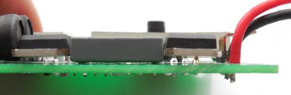 W ten sposób najwyższymi elementami stają się wyświetlacze. Płytkę można bez przeszkód dokręcić do czoła obudowy. Do tych elementów należą: kondensatory elektrolityczne, dławiki, tranzystory wysokonapięciowe, kondensator C9 i stabilizator 7805. Jeżeli chodzi o trzy podzespoły w obudowach TO220, to należy je przylutować 2..3 mm nad powierzchnią płytki, aby metalowa wkładka nie spowodowała zwarcia ze znajdującymi się pod nią ścieżkami. Szczególnie dotyczy to tranzystorów STP4NK60Z, w których obudowa jest połączona z drenem, a ten z kolei znajduje się na wysokim potencjale dodatnim. Przedstawia to fotografia 5. Do pól lutowniczych PAD1 i PAD2 należy przylutować krótkie przewody w wytrzymałej izolacji, zakończone krokodylkami – dołączanie formowanych kondensatorów będzie wtedy znacznie łatwiejsze.