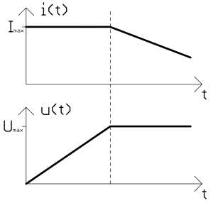 Schematyczne przedstawienie zmian prądu i napięcia w czasie obrazuje rysunek 2. Linia przerywana to przejście z jednego trybu w drugi.