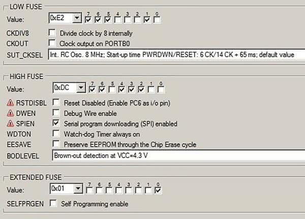 Jeżeli montaż został zakończony, należy zaprogramować mikrokontroler dołączonym plikiem oraz zmienić bity zabezpieczające: wyłączyć podział częstotliwości zegara przez 8 oraz uruchomić Brown-Out Detector na napięcie 4,3 V. Bajty po konfiguracji: