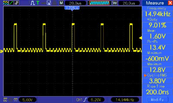 Warunki są sprawdzane co ok. 1 ms. Generator PWM pracuje w trybie odwróconym, tj. zwiększanie zawartości rejestru OCR1B zmniejsza wypełnienie. Utrzymywane napięcie fluktuuje o ok. 2…3 V, co w zupełności wystarcza do tego zastosowania.