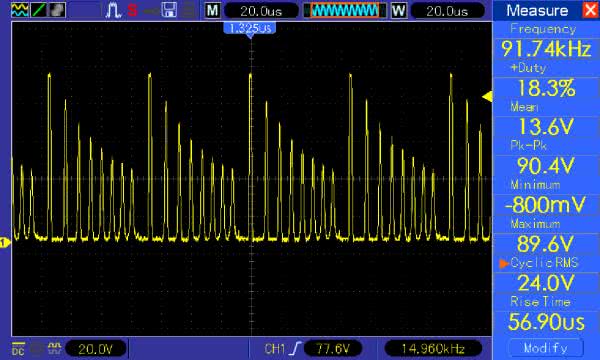 Na rysunku 10 zamieszczono oscylogram napięcia bramka-źródło tranzystora T3. Zafalowania widoczne podczas wyłączenia tranzystora pochodzą od tętnień, które przechodzą na bramkę przez pojemność Cgd. Tętnienia te mają wartość ok. 1,5 Vpp, czyli zdecydowanie zbyt mało, by w niekontrolowany sposób otworzyć tranzystor. Na tym oscylogramie nie można ocenić stromości zboczy, lecz nie widać rażących dysproporcji między zboczem narastającym a opadającym, co oznacza, że driver bramki działa poprawnie. Te tętnienia widać wyraźnie na rysunku 11, który przedstawia przebieg czasowy napięcia dren-źródło tego samego tranzystora. Są one skutkiem oscylacji dławika przetwornicy na własnej częstotliwości rezonansowej, znacznie wyższej od częstotliwości kluczującej tranzystor. Najwyższy impuls otwiera diodę D4 i doładowuje formowany kondensator – pozostałe nie mają żadnego znaczenia, ponieważ ta przetwornica nie była optymalizowana pod kątem sprawności.