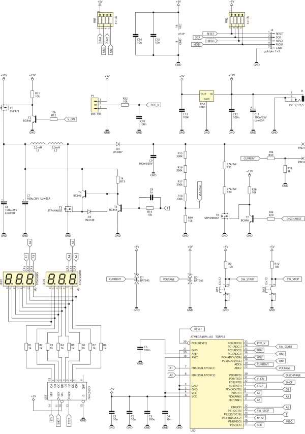 Pracą całego układu zarządza mikrokontroler ATmega48 w obudowie TQFP32. Stabilizowane napięcie 5 V, którego wymaga do poprawnej pracy, jest dostarczane przez stabilizator US3. Kondensatory C1…C4 w szerokim zakresie częstotliwości zmniejszają impedancję źródła zasilającego mikrokontroler. Z kolei kondensatory C12 i C13 są niezbędne do poprawnej pracy stabilizatora typu 7805. Kondensator C5 jest elementem zalecanym przez producenta mikrokontrolera do poprawnej pracy przetwornika A/C.