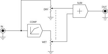 Mikser najczęściej jest używany do realizacji kompresji równoległej typu "New York" lub w układach opóźniających, jak pokazano na rysunku 1.