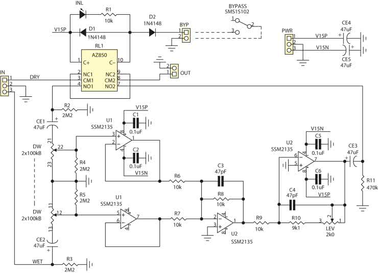 Schemat ideowy proponowanego rozwiązania miksera pokazano na rysunku 2. Do gniazda wejściowego IN doprowadzono sygnały Dry/Wet, odpowiednio, z wejścia i wyjścia zastosowanego efektu. Podobnie jak w pozostałych modułach, sygnał BYP (bypass) jest doprowadzony do złącza BYP i służy do przełączenia sygnału DRY bezpośrednio na wyjście OUT miksera, gdy urządzenie jest nieaktywne. Każdy z sygnałów jest doprowadzony do podwójnego potencjometru DW, którego poszczególne sekcje połączone są przeciwbieżnie, aby zwiększanie poziomu sygnału Dry zmniejszało poziom sygnału Wet.