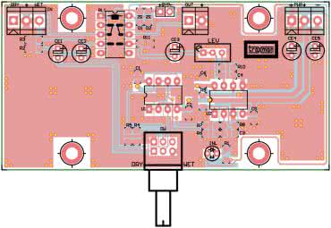 Do złącza PWR doprowadzono zasilanie ±15 V/100 mA. Dioda świecąca INL sygnalizuje włączenie układu w tor sygnału.