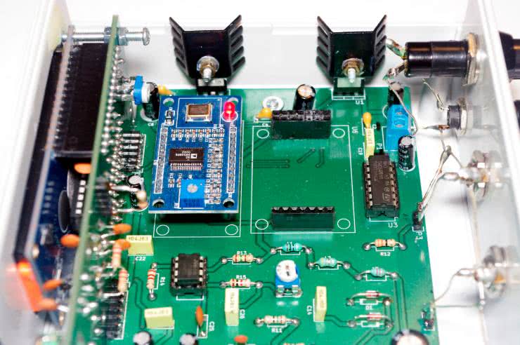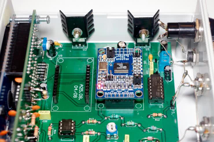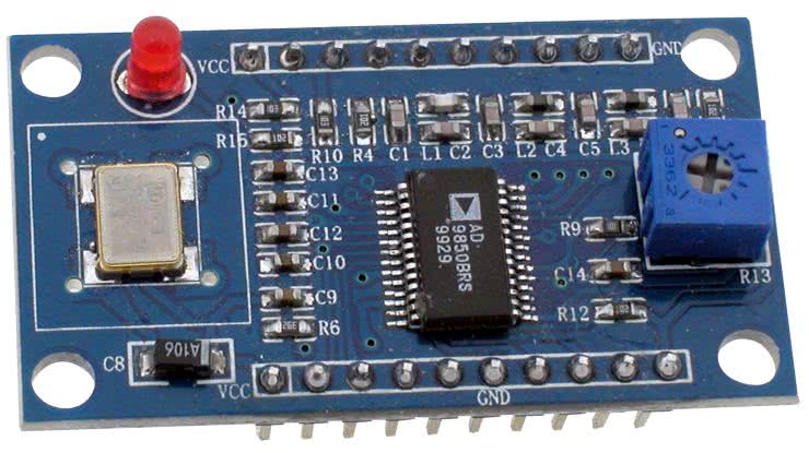 Ostatnie nieomówione dotychczas bloki to serce całego przyrządu, czyli moduły DDS: U5 i U6 z kośćmi AD9850, taktowanymi stabilizowanymi termicznie rezonatorami OCXO. Na głównej płytce drukowanej przyrządu zlokalizowane zostały gniazda dla dwóch alternatywnie stosowanych modułów (fotografia 9, fotografia 10), jednak w praktyce należy użyć tylko jednego z nich. Linie wejściowe (programujące: W_CLK, FQ_UD, DATA oraz RESET) i wyjściowe (analogowy sinus oraz cyfrowy prostokąt) zostały zatem połączone bez ryzyka uszkodzenia urządzenia.