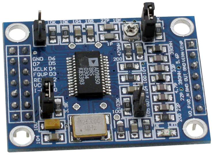 Swoją popularność zawdzięcza on głównie zastosowaniu w dwóch łatwo dostępnych modułach generatorów, pokazanych na fot. 1 i 2. Układ ten działa w oparciu o zasadę odtwarzania wyliczanych „w locie” próbek sygnału, generowanego za pomocą 10-bitowego przetwornika C/A, taktowanego ze stałą częstotliwością, wytwarzaną przez stabilizowany termicznie generator kwarcowy OCXO. Układ scalony AD9850 może pracować z napięciem zasilania Vdd z zakresu 3,3…5 V. Maksymalna częstotliwość taktowania Fs oraz moc strat Ptot wynoszą wtedy 155 mW przy 110 MHz oraz 380 mW przy 125 MHz (wyczuwa się lekkie grzanie się pracującego układu). Deklarowana przez producenta wartość parametru SFDR oznaczającego stosunek amplitudy użytecznego sygnału wyjściowego do najsilniejszego sygnału zakłócającego (miara dokładności odwzorowania sygnału przez przetwornik DAC), przy częstotliwości generowanego sygnału sinusoidalnego równej Fc=40 MHz, jest lepsza od 50 dB, co można uznać za wartość zadowalającą w większości zastosowań radioamatorskich. Trzeba tu jednak wyraźnie podkreślić, że przy tak małym stosunku częstotliwości generowanej Fc=40 MHz do częstotliwości próbkowania Fs=125 MHz równym 0,32 próbkowanie odbywa się zbyt rzadko, aby jakość odwzorowania sygnału w dziedzinie czasu była wystarczająca dla większości zastosowań. W praktyce, wykorzystując tylko filtry dolnoprzepustowe LC, zaimplementowane w opisywanych modułach DDS, jesteśmy w stanie uzyskać przebiegi sinusoidalne i prostokątne o jakości niebudzącej zastrzeżeń tylko w zakresie do kilkunastu MHz. Przy większych wymaganiach na czystość widmową generowanego dla przebiegu sinusoidalnego warto zastosować dodatkowe filtry dolno- lub pasmowoprzepustowe.