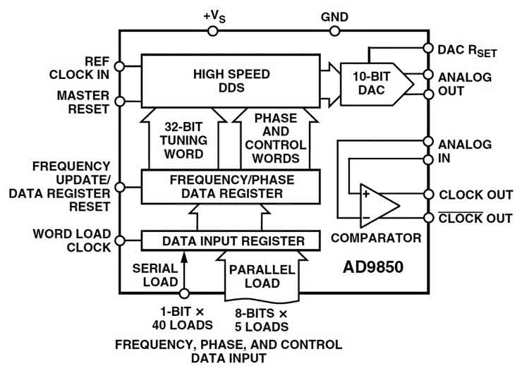 Programowanie układu AD9850 może odbywać się metodą szeregową lub równoległą. Przy zastosowaniu szybszej metody równoległej aktywnie wykorzystywane są piny D0…D7 (programowanie odbywa się przez przekazanie do układu AD9850 pięciu 8-bitowych słów sterujących), natomiast przy programowaniu szeregowym do przekazania tych danych (40 bitów) wykorzystywane są tylko wejścia: W_CLK, FQ_UD, DATA oraz RESET. Przy zastosowaniu układu jako zwykłego generatora wolno przestrajanego w zupełności wystarczy powolniejszy transfer szeregowy, wymagający mniejszej ilości połączeń (programowanie równoległe z natury będzie około 8-krotnie szybsze, co może być przydatne, gdy układ DDS chcielibyśmy wykorzystać np. jako element modemu FSK czy PSK).