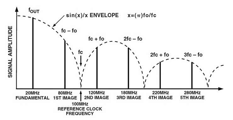 Rysunek 6, także zaczerpnięty z noty katalogowej układu AD9850, pokazuje rozkład widmowy sygnału dla przykładowego przypadku syntezy z częstotliwością próbkowania Fs=Fclk=100 MHz i podstawową częstotliwością wyjściową Fc=Fout=20 MHz. Jak widać, widmo to jest objęte obwiednią wg funkcji sinc(x)=sin(x)/x i – oprócz podstawowej harmonicznej Fout – zawiera także m.in. pasożytniczy sygnał o częstotliwości Fs–Fc=80 MHz (efekt tzw. aliasingu). Z wykresu widać jasno to, że poziom tego sygnału pasożytniczego jest tym większy, im większy jest stosunek częstotliwości Fc/Fs=Fout/Fclk.