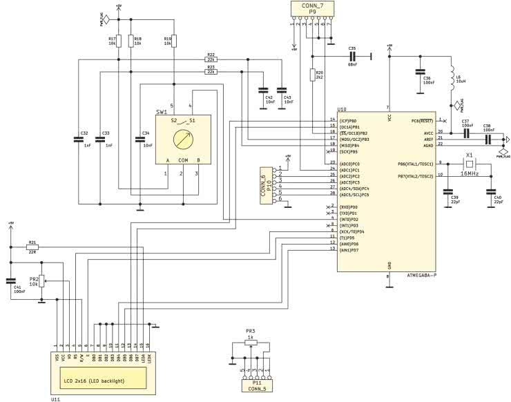 Rysunek 7 prezentuje część sterującą układu, umieszczoną na dwuwarstwowej płytce drukowanej, zamocowanej do przedniego panelu przyrządu. Znajdują się na niej m.in.: mikrokontroler ATmega8A (U10), alfanumeryczny wyświetlacz LCD 16×2 (U11), mechaniczny enkoder obrotowy (SW1) z przyciskiem, przeznaczony do parametryzacji przyrządu oraz potencjometr obrotowy PR3, wyprowadzony na złącze P11, którym jest ustalany poziom wyjściowego sygnału sinusoidalnego. Rezystor R21 ogranicza prąd podświetlenia wyświetlacza LCD i należy dobrać go zależnie od typu zastosowanego modułu LCD.