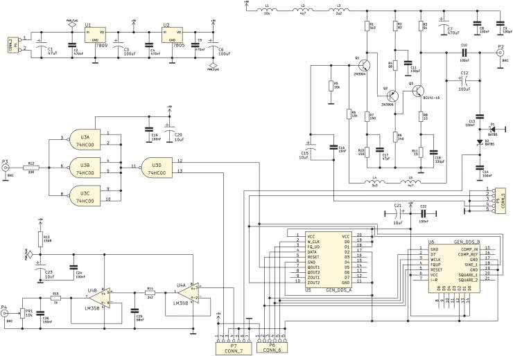 Wzmacniacz filtru dla sygnału odchylania został oparty na podwójnym wzmacniaczu operacyjnym U4A i U4B (LM358), zasilany poprzez rezystor R13 oraz kondensatory C23 i C24. Oba wzmacniacze operacyjne pracują w topologii wtórników napięciowych, zapewniających prawidłową realizację trójstopniowego filtru RC z elementami: R20-C35 (na omówionej powyżej panelowej płytce sterowania urządzeniem) oraz R14-C25 i R15-C36. Regulację napięcia wyjściowego, w zakresie 0…5 V, można przeprowadzić za pomocą potencjometru montażowego PR1 w celu wstępnego dostosowania go do czułości wejścia „X” wykorzystywanego oscyloskopu. Sygnał ten jest wyprowadzony na port P4 (gniazdo BNC). Wygenerowany sygnał sinusoidalny, regulowany i przekazywany poprzez potencjometr PR3, po dwukrotnym przejściu przez parę portów: P5-P11, trafia do wzmacniacza szerokopasmowego z tranzystorami: Q1…Q3. Ma on rezystancję wyjściową zbliżoną do 50 Ω i wzmocnienie 12 dB w 3-decybelowym paśmie 40 MHz. Został zaprojektowany z zastosowaniem popularnych tranzystorów (2N3904, 2N3906 i BC141-16) poprzez optymalizację wzmocnienia i pasma przenoszenia każdego ze stopni w taki sposób, by finalne pasmo przenoszenia całego układu odpowiadało oczekiwanym założeniom.