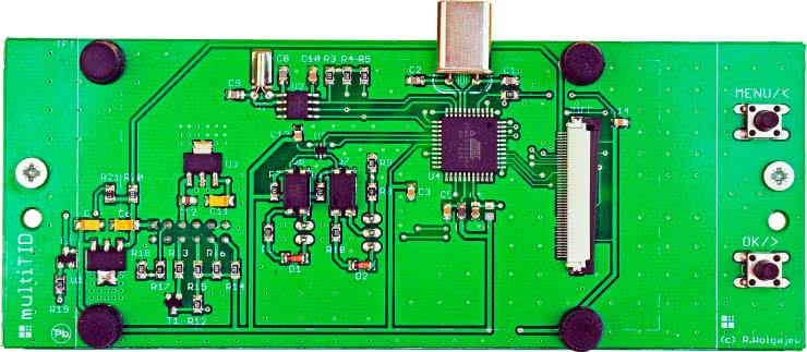 Schemat montażowy komputera samochodowego multiTID pokazano na rysunku 8, opublikowanym w poprzedniej części artykułu w EP 1/2017. Zaprojektowano zwarty, dwustronny obwód drukowany, złożony w głównej mierze z elementów przeznaczonych do montażu powierzchniowego. Co bardzo ważne w wypadku pracy w środowisku o potencjalnie dużym poziomie zaburzeń, jakim bez wątpienia jest instalacja samochodowa, zadbano o odpowiednie prowadzenie masy i sygnałów krytycznych.