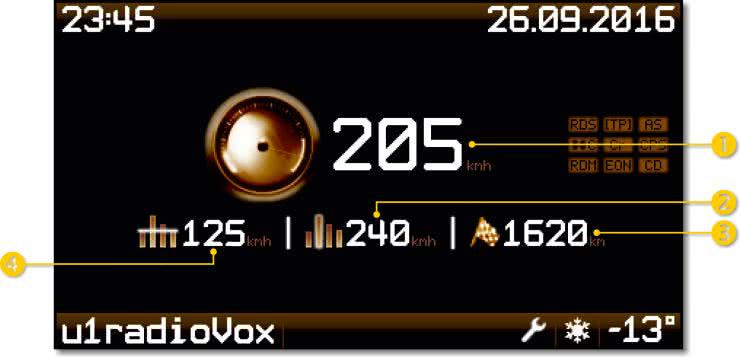 Na rysunku 13 pokazano wygląd "Menu prędkości" z opisem wyświetlanych danych. Znaczenie poszczególnych danych jest następujące: