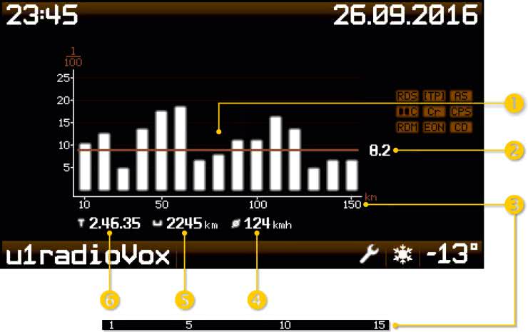 - Słupki reprezentujące średnie zużycie paliwa, dla bieżącego rodzaju paliwa, na każde przejechane 10 km lub 1 km (w zależności od wybranej opcji). Możliwość wyświetlenia kolejnego "słupka" zależy, co oczywiste, od aktualnie przejechanego dystansu oraz wybranej skali wykresu. Wykres pokazuje zawsze statystyki dla ostatnio przejechanych 150 km lub 15 km i jest aktualizowany co jednostkę skali dystansu (przesuwa się w lewo po przejechaniu 150 km lub 15 km).