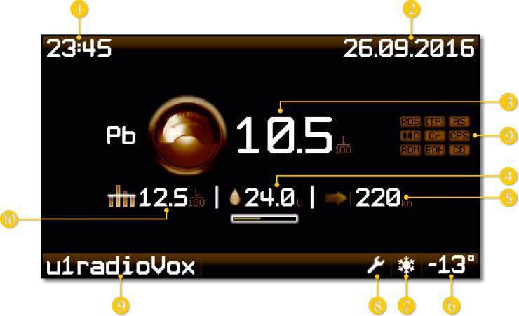 - Dostępna ilość aktualnie używanego paliwa (w tym, graficzna prezentacja w formie bargrafu, który zmienia kolor na czerwony w przypadku, jeśli w zbiorniku jest poniżej 10% paliwa).
