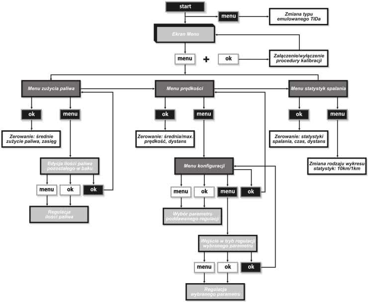 Na rysunku 11 pokazano diagram obrazujący system menu oraz sposób obsługi urządzenia. Na tym rysunku symbole przycisków wypełnione kolorem czarnym oznaczają długie naciśnięcie wybranego przycisku. Warto zauważyć, że funkcja wyświetlania ilości dostępnego paliwa w zbiorniku nie korzysta z sygnału informującego o rzeczywistym poziomie paliwa, gdyż jej implementacja, skalowanie i samo włączenie sterownika do instalacji pojazdu byłoby dość kłopotliwe. Mechanizm jej działania jest w tym wypadku bardzo prosty i zakłada każdorazowe uzupełnianie bieżącego odczytu o ilość zatankowanego paliwa, co jest możliwe poprzez wejście w tryb edycji paliwa dostępnego w zbiorniku. A więc po każdym tankowaniu pojazdu należy wejść w edycję dostępnego paliwa i zwiększyć jego ilość o zatankowaną wartość (zmiana o pełne litry). Mechanizm pomiarowy sterownika multiTID będzie następnie odejmował od wartości dostępnego paliwa zużywane paliwo, co umożliwia realizację wspomnianej funkcjonalności.