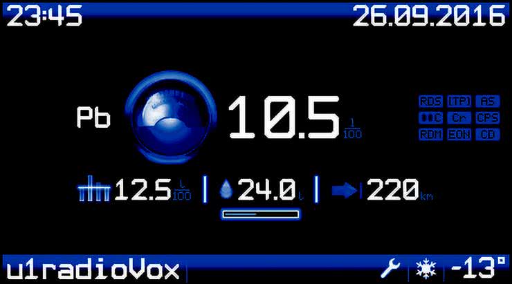 Opcja "Info bar offset" służy do przesunięcia górnej i dolnej "belki informacyjnej" w kierunku środka ekranu o zadaną liczbę pikseli obrazu (0...9). Funkcja ta może być użyteczna w przypadku, gdy pionowy wymiar okna przeznaczonego na montaż oryginalnego wyświetlacza TID jest mniejszy niż wysokość ekranu, co powodowałoby przesłanianie "belek" informacyjnych i zawartych tam informacji. Z kolei opcja "Interface type" pozwala na zmianę kolorystyki całego interfejsu użytkownika z kolorów sepii na niebieski i odwrotnie. Wygląd przykładowego Menu zużycia paliwa w kolorystyce niebieskiej pokazano na fotografii 16.