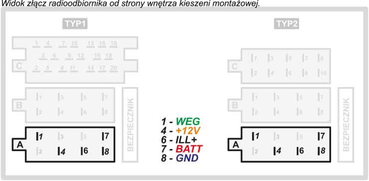 Wygląd typowych złączy ISO radioodbiornika wraz z zaznaczeniem interesujących nas wyprowadzeń pokazano na rysunku 10. Co ciekawe, w zależności od marki pojazdu, piny o numerach 4 i 7 (oznaczone jako +12 V i BATT) mogą być zamienione miejscami, dlatego ich rzeczywiste funkcje należy ustalić eksperymentalnie. Napięcie na pinie +12 V powinno występować wyłącznie po włączeniu zapłonu (przekręceniu kluczyka), a na pinie BATT na stałe. Napięcie na pinie ILL+ to zwyczajowo przebieg prostokątny o amplitudzie ok. +12 V i wypełnieniu zależnym od ustawienia pokrętła regulującego jasność podświetlenia zegarów pojazdu. To napięcie jest używane do regulacji jasności podświetlenia wyświetlacza urządzenia multiTID. Jeśli nie zależy nam na takiej funkcjonalności, pin ILL+ należy zewrzeć z pinem +12 V.