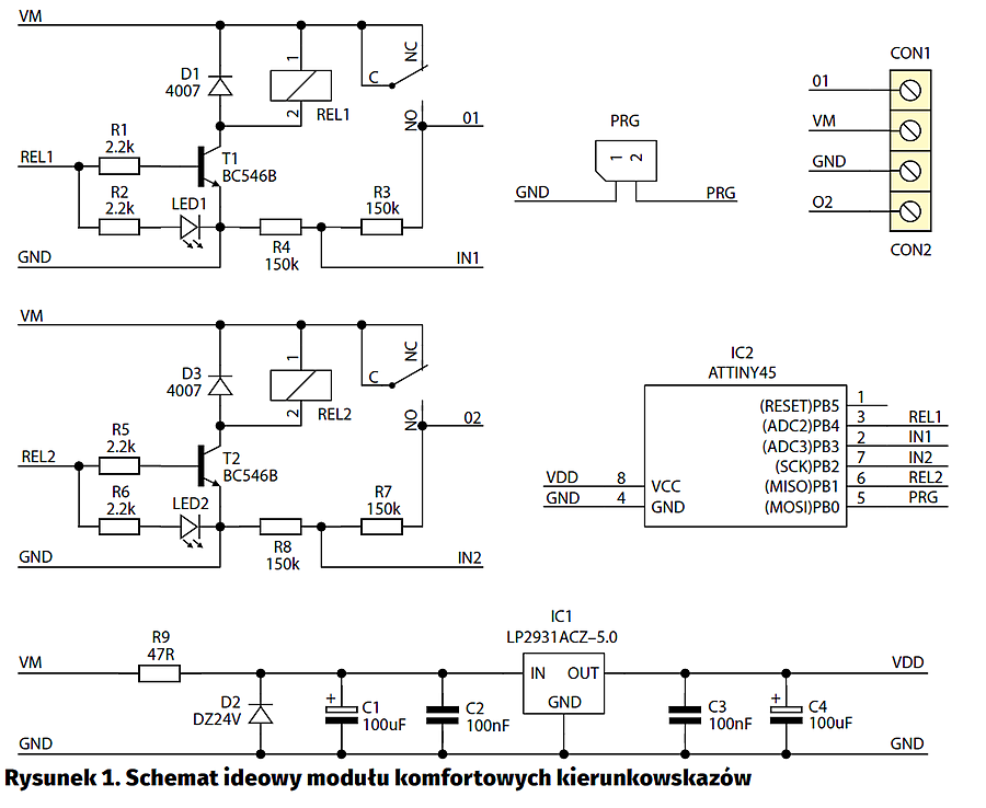 Schemat ideowy modułu pokazano na rysunku 1. Na schemacie można wyróżnić blok zasilania ze stabilizatorem IC1, dwa bliźniacze bloki wykonawcze z przekaźnikami REL1 i REL2 oraz blok sterujący z mikrokontrolerem IC2. Najważniejszego bloku urządzenia nie widać na schemacie – jest to program sterujący, zawarty w pamięci mikrokontrolera.